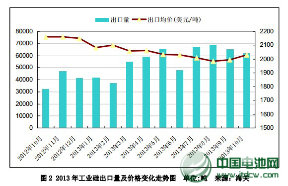海關(guān)統(tǒng)計(jì)數(shù)據(jù)顯示,2013 年 10 月份我國(guó)工業(yè)硅出口量為 6.2 萬(wàn)噸,環(huán)比下降 5.1%,同比上升 75.0%。10 月份出口均價(jià)為 2032 美元/千克,環(huán)比微幅上升。