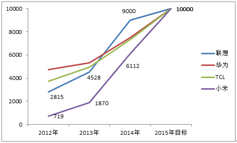 2015年是個關鍵節點,這一年將有幾家國產手機廠商的年銷量超過1億部。曾對外表態2015年目標是超1億部的廠商有5家。中興三年前年銷量已經近7000萬部,三年目標中提過,但歷經虧損轉型,目前看不現實。而且中興終端事業部CEO曾學忠曾明確表示,2015年中興智能手機銷量目標是6000萬部,按當前手機市場智能機占比90%倒推,2015年中興全部手機銷量目標在6600-7000萬部。剩下的四家分別是聯想、華為、TCL、小米,我們來逐一分析一下。