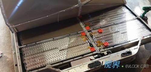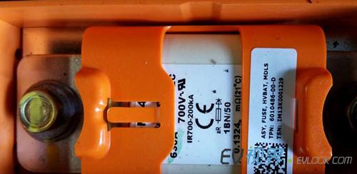 5.單個電池模塊俯瞰圖 6.將電壓表接上主觸點的hot side部分,即可讀取整個電池組的電壓——313.8V。 7. 單個電池模塊電壓196.3V 8. 近距離觀察電池組的主保險
