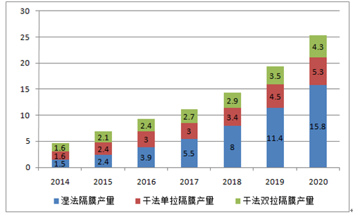 2014-2020 年鋰電池隔膜產量預測(億平方米 )