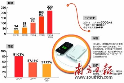移動(dòng)電源生產(chǎn)企業(yè)的數(shù)量在去年急劇“縮水”,但就行業(yè)規(guī)模而言,近幾年來(lái)移動(dòng)電源市場(chǎng)卻仍然保持著不斷增長(zhǎng)的勢(shì)頭。賽迪顧問(wèn)和中國(guó)電池網(wǎng)聯(lián)合發(fā)布的《2014年度中國(guó)移動(dòng)電源行業(yè)市場(chǎng)研究報(bào)告》顯示,從整個(gè)行業(yè)的市場(chǎng)規(guī)模來(lái)看,2011年到2014年,我國(guó)移動(dòng)電源市場(chǎng)規(guī)模分別為34億元、58億元、105億元、165億元。其中2014年,移動(dòng)電源行業(yè)的市場(chǎng)規(guī)模同比增長(zhǎng)了57.14%,雖然增速較2013年的81.03%有所下滑,但依舊保持了50%以上的增長(zhǎng)幅度。