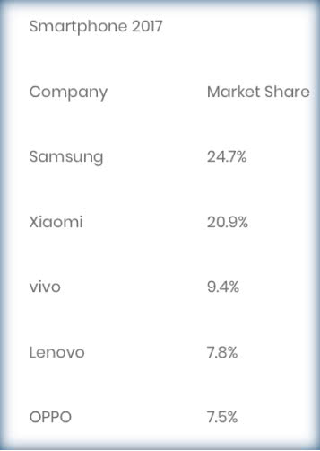 下圖數(shù)據(jù)顯示,2017年印度智能手機(jī)市場(chǎng)份額中三星排名第一,之后四席為小米、vivo、聯(lián)想和OPPO。