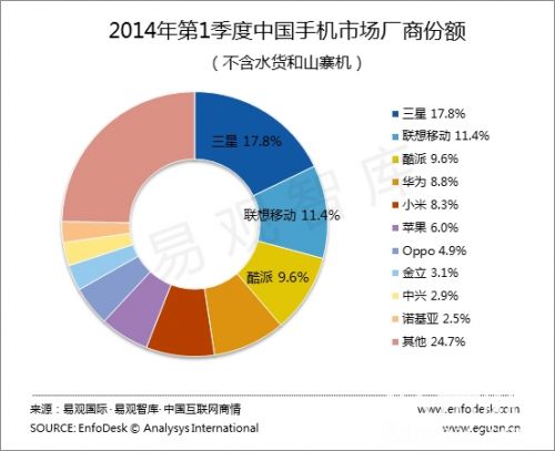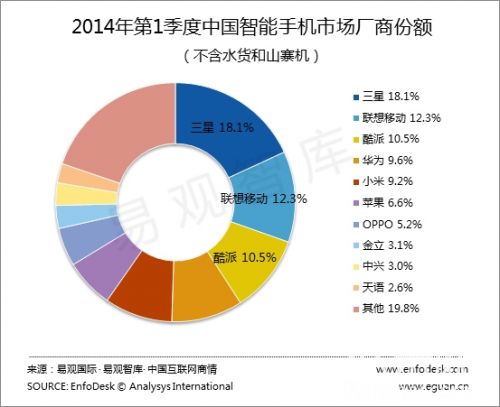 根據EnfoDesk易觀智庫的《中國手機市場季度監測報告2014年第1季度》顯示,第1季度無論從普通手機還是智能手機市場廠商份額上來講,華為均略勝小米一籌。
