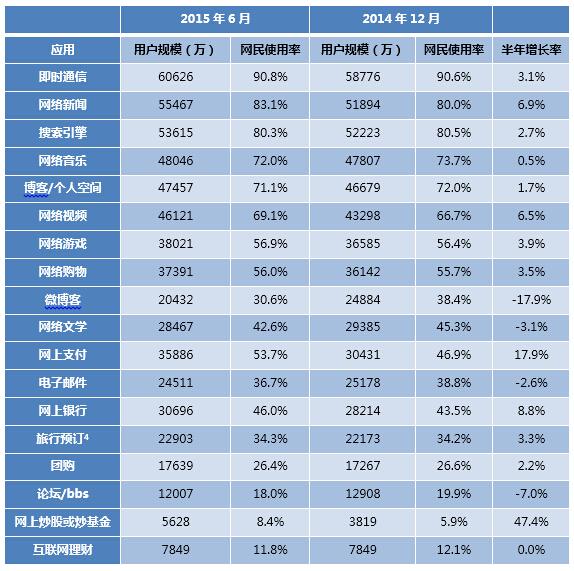 2014.12-2015.6中國網(wǎng)民對各類網(wǎng)絡應用的使用率
