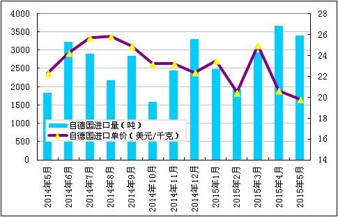 2015年5月份從德國(guó)進(jìn)口多晶硅量減少至3402噸,環(huán)比降幅為7.2%;5月份進(jìn)口單價(jià)下滑至19.78美元/千克,環(huán)比跌幅為4.1%。