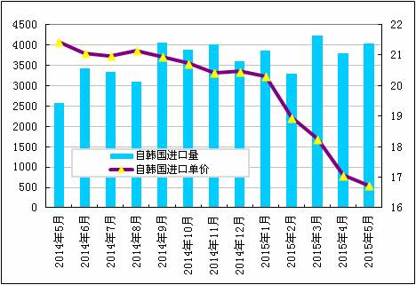 2015年5月份從韓國(guó)進(jìn)口多晶硅量增加至4027噸,環(huán)比增幅為6.1%;5月份進(jìn)口單價(jià)小幅下滑至16.74美元/千克,環(huán)比降幅為1.9%。