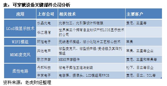 仔細分析其產業鏈,事實上可穿戴設備需要使用的幾個關鍵元器件包括攝像頭、電路板、柔性材料、觸控面板、電池等模組。此外,智能眼鏡+手表的硬件組合也需要兩個產品之間頻繁的信號互聯, 勢必增加對無線模組的需求。