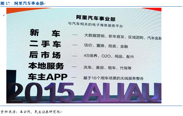 阿里成立汽車事業(yè)部,搭建全新平臺(tái),力圖向車主提供看車、選車、買車、用車、賣車全鏈路的汽車電商服務(wù)。2015年4月,阿里宣布成立汽車事業(yè)部,由原天貓汽車、淘寶汽車、汽車O2O三個(gè)團(tuán)隊(duì)合并而成,未來(lái)將以“車主+”戰(zhàn)略為中心建立一個(gè)新的平臺(tái),并與負(fù)責(zé)大數(shù)據(jù)營(yíng)銷的阿里媽媽、汽車金融的螞蟻金服以及汽車生態(tài)產(chǎn)業(yè)鏈各方協(xié)同合作,力圖向車主提供看車、選車、買車、用車、賣車全鏈路的汽車電商服務(wù)。