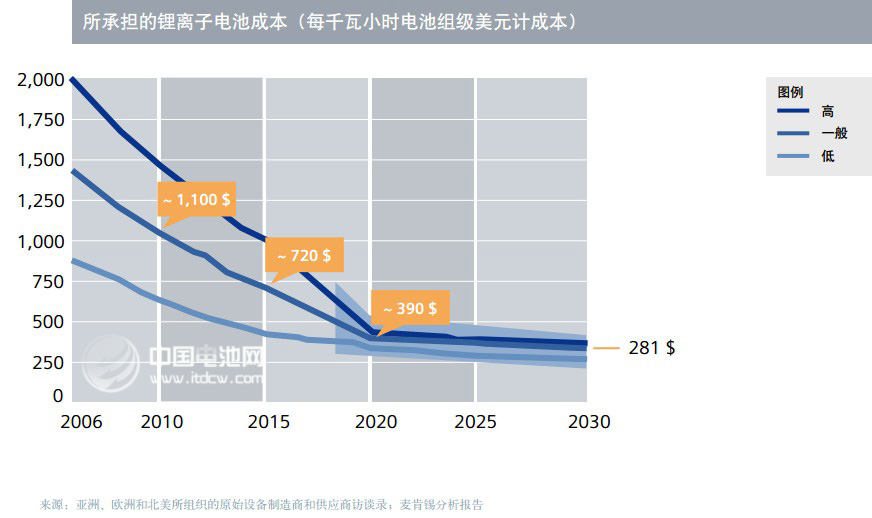 2010-2020年所承擔(dān)的鋰離子電池成本將持續(xù)下降趨勢(shì)(每千瓦小時(shí)電池組級(jí)美元計(jì)成本)