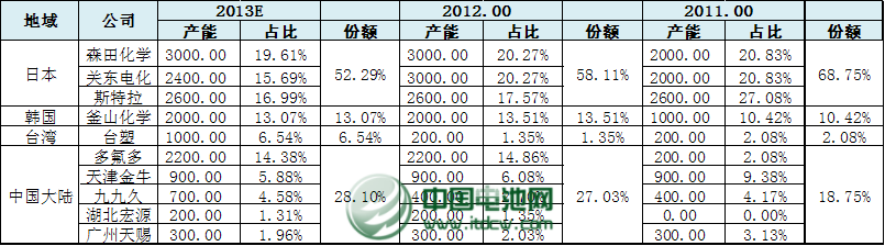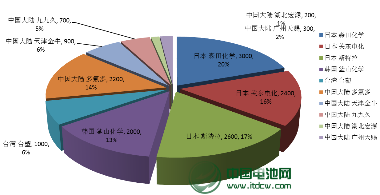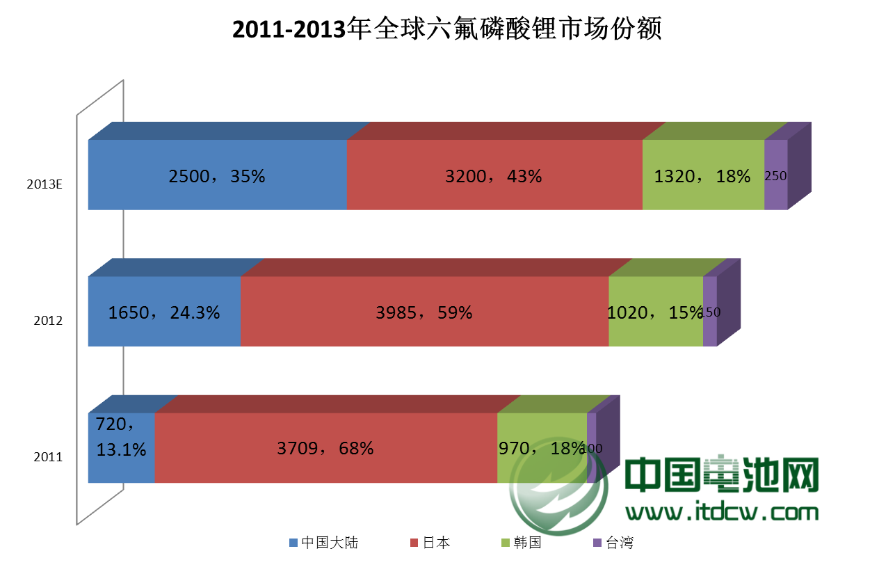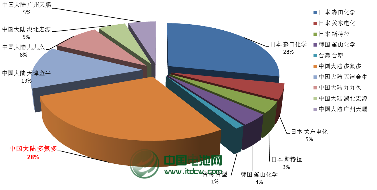 中國(guó)電池雜志-中國(guó)電池網(wǎng)12月10日訊(肖何 北京報(bào)道)近日,多氟多化工股份有限公司(以下稱“多氟多”)副總經(jīng)理李云峰對(duì)中國(guó)電池網(wǎng)表示,六氟磷酸鋰行業(yè)正面臨著激烈的市場(chǎng)競(jìng)爭(zhēng)和挑戰(zhàn),他表示,日韓及中國(guó)和中國(guó)臺(tái)灣占據(jù)了全球六氟磷酸鋰市場(chǎng)的絕大部分份額,其中日本的森田化學(xué)、關(guān)東電化、斯特拉等三家企業(yè)從2011年68.75%下降到今年10月的52.29%,而韓國(guó)的釜山化學(xué)相比有所提升,目前占全球份額的13.07%。而中國(guó)的多氟多、天津金牛、九九久、湖北宏源、廣州天賜等五家企業(yè)占據(jù)28.10%的市場(chǎng)份額,六氟磷酸鋰的國(guó)產(chǎn)化仍有提升空間。