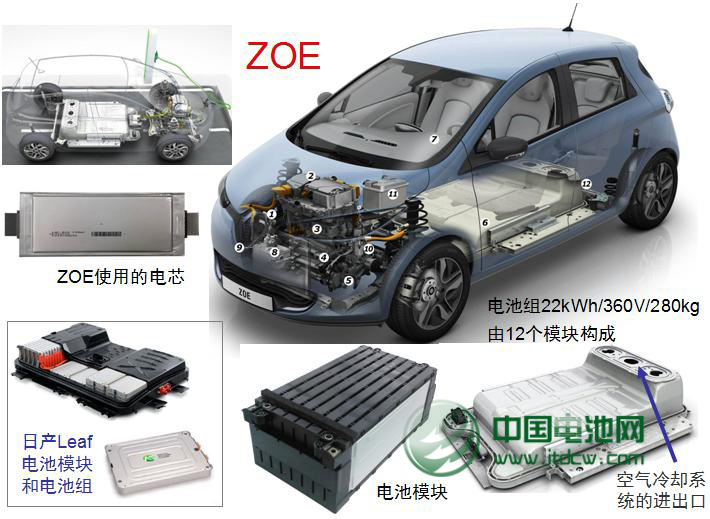 ZOE的電池模塊與Leaf的對比(ZOE尺寸為長4,084×寬1,730×高1,562mm,軸距2,588mm,整備質(zhì)量467kg;電機(jī)功率66kW,最大80kW;最大扭矩271N·m;最高時速135km/h;一次充電最大續(xù)航里程:210km(廠家提供數(shù)據(jù)),160km(第三方提供數(shù)據(jù)))