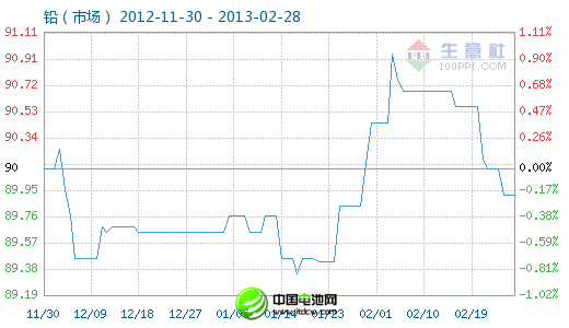 2月27日鉛(市場)商品指數為89.92,與昨日持平,較周期內最高點100.00點(2011-09-01)下降了10.08%,較2011年09月29日最低點86.80點上漲了3.59%。(注:周期指2011-09-01至今)