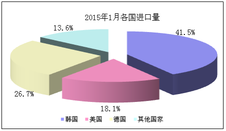 據1月份分國別進口數據顯示,自韓國、美國、德國三國共進口多晶硅8040噸,占總進口量的86.4%,其中從韓國進口量為3867噸,占總進口量的41.5%;從美國進口量為1683噸,占總進口量的18.1%;從德國進口量為2490噸,占總進口量的26.7%;其他地區進口量為1269噸,占總量的13.6%。