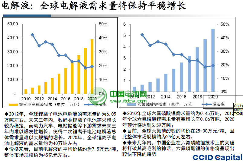 價格來看,目前電解液的平均價格約為7.5萬元/噸,整體市場規(guī)模約為45億元左右。