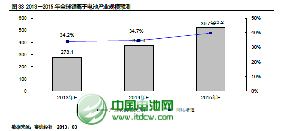 預計到2013 年全球鋰離子電池產(chǎn)業(yè)規(guī)模將達到278.1 億美元,2015 年,新能源汽車的產(chǎn)業(yè)化應用將帶動全球鋰離子電池的產(chǎn)業(yè)規(guī)模達到523.2 億美元。
