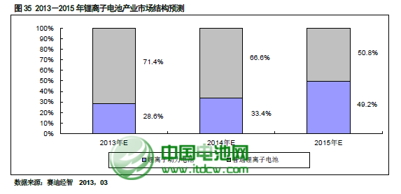 從鋰離子電池市場結構來看,我們認為鋰離子市場規(guī)模未來三年內增長的動力來自于以新能源汽車電池為代表的動力電池。到2015 年鋰離子動力電池市場規(guī)模占比將達到49.2%。