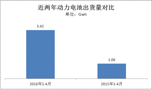 源于政策紅利的引導(dǎo)輔以私人消費(fèi)信心的培育以及充電基礎(chǔ)設(shè)施等多方面的發(fā)展,新能源汽車市場(chǎng)也逐步走向穩(wěn)增長(zhǎng)。據(jù)中汽協(xié)數(shù)據(jù)統(tǒng)計(jì),2016年1-4月新能源汽車產(chǎn)量94442輛,比上年同期增長(zhǎng)126.8%。而作為核心零部件的動(dòng)力電池也跟隨新能源汽車整體市場(chǎng)走向,呈現(xiàn)高增長(zhǎng)趨勢(shì)。據(jù)第一電動(dòng)研究院數(shù)據(jù)梳理,2016年1-4月動(dòng)力電池出貨量達(dá)3.42Gwh,較之去年同期1.06wh的出貨量實(shí)現(xiàn)同比增長(zhǎng)2.38倍。(注釋:以下動(dòng)力電池?cái)?shù)據(jù)源于新能源汽車產(chǎn)量與其搭載的電池容量乘積。由于未考慮其他影響因素,總體實(shí)際產(chǎn)能會(huì)略高于此。電池出貨量計(jì)算公式:車型搭載電池容量*車型產(chǎn)量。