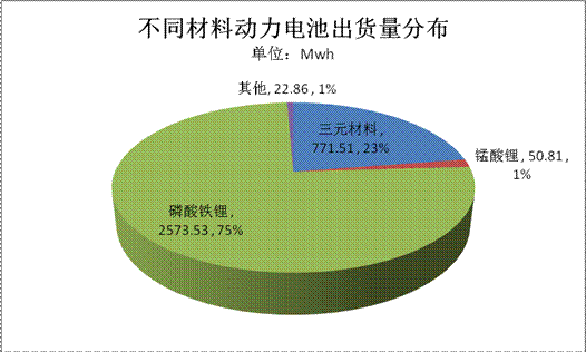 目前電池類型主要為磷酸鐵鋰和三元材料,兩者累計(jì)出貨量達(dá)3.34Gwh,占比總量的97.66%。對(duì)比兩種電池材料的應(yīng)用領(lǐng)域看,兩者在乘用車、客車、專用車領(lǐng)域均有分布,但磷酸鐵鋰電池主要集中應(yīng)用于客車、乘用車領(lǐng)域,兩部分電池出貨量分布為1.5Gwh 和1Gwh,均超過(guò)1Gwh,占比磷酸鐵鋰電池總量(2.57Gwh)的97%;而三元材料電池受制于政府此前暫停三元鋰電池客車列入新能源汽車推廣應(yīng)用推薦車型目錄,使得該類型電池主要集中應(yīng)用于乘用車領(lǐng)域。