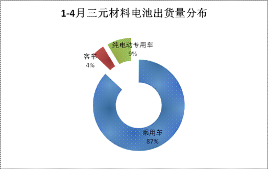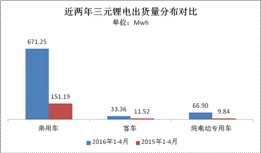 三元鋰電池方面,此前政策要求暫停三元鋰電應(yīng)用于客車領(lǐng)域,但從今年與去年同期出貨量數(shù)據(jù)比較看,這對(duì)三元鋰電的總產(chǎn)能并未造成太大影響,與2015年1-4月三元鋰電池出貨量(172.55Mwh)對(duì)比,今年實(shí)現(xiàn)了3.47倍的同比增幅,凈增量達(dá)600Mwh。細(xì)分看,三元鋰電在客車領(lǐng)域的變化基本不達(dá),僅增21Mwh左右;對(duì)應(yīng)的其產(chǎn)能在乘用車領(lǐng)域的增幅最為明顯,同比增幅達(dá)3.44倍,凈增量達(dá)520Mwh;其次,三元鋰電在專用車領(lǐng)域的變化也伴隨專用車產(chǎn)量的走勢(shì)逐步遞增,電池搭載量增量達(dá)57Mwh,增幅達(dá)5.7倍。