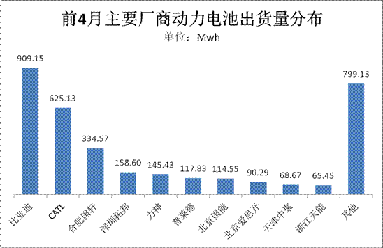 細(xì)分動(dòng)力電池生產(chǎn)廠商看,前4月電池有產(chǎn)量的廠商數(shù)量近90家,其中排名前10位的廠商電池出貨量累計(jì)達(dá)2.63Gwh,占比高達(dá)77%;而出貨量超過(guò)100Mwh的廠商數(shù)量?jī)H7家:比亞迪、CATL、國(guó)軒高科、深圳拓邦、力神、普萊德、國(guó)能,7家電池出貨量累計(jì)達(dá)2.4Gwh,占比70%。