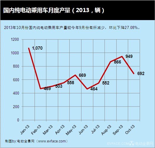 2013年10月份國(guó)內(nèi)純電動(dòng)乘用車產(chǎn)量692輛,較今年9月份產(chǎn)量有所減少,環(huán)比下降27.08%,與去年10月份相比,同比下降40.41%。
