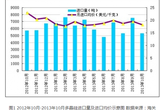 2013年10月份我國(guó)多晶硅進(jìn)口呈現(xiàn)量?jī)r(jià)齊跌的態(tài)勢(shì),雖然進(jìn)口量有所減少,但是多晶硅低價(jià)傾銷進(jìn)一步加劇。據(jù)最新海關(guān)統(tǒng)計(jì)數(shù)據(jù)顯示,10月份多晶硅進(jìn)口量為5328噸,環(huán)比大幅減少29.1%;多晶硅進(jìn)口均價(jià)下滑至18.27美元/千克,環(huán)比下降6.7%,同比下滑20.6%。同時(shí),10月份一般貿(mào)易方式進(jìn)口多晶硅為1289噸,在總進(jìn)口量中占比僅為24.2%,加工貿(mào)易等方式進(jìn)口量為4039噸,雖環(huán)比減少32.3%,但在總進(jìn)口量中占比仍高達(dá)75.8%。值得業(yè)內(nèi)關(guān)注的是,國(guó)外規(guī)避“雙反”又出新招——轉(zhuǎn)口臺(tái)灣,10月份從臺(tái)灣進(jìn)口多晶硅達(dá)623噸,占總進(jìn)口量的11.7%。