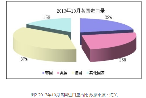 據(jù)10月份分國(guó)別進(jìn)口數(shù)據(jù)顯示,自韓國(guó)、美國(guó)、德國(guó)三國(guó)共進(jìn)口多晶硅4519噸,占總進(jìn)口量的84.8%,其中從韓國(guó)進(jìn)口量為1154噸,占總進(jìn)口量的21.7%;從美國(guó)進(jìn)口量為1377噸,占總進(jìn)口量的25.8%;從德國(guó)進(jìn)口量為1988噸,占總進(jìn)口量的37.3%;其他地區(qū)進(jìn)口量為1080噸,僅占總量的15.2%。自美國(guó)、韓國(guó)和德國(guó)進(jìn)口多晶硅量均有不同程度減少,其中自韓國(guó)進(jìn)口量降幅最大,跌幅為45.5%,與韓國(guó)OCI公司發(fā)生的事故有一定關(guān)聯(lián),導(dǎo)致多晶硅供應(yīng)減少。