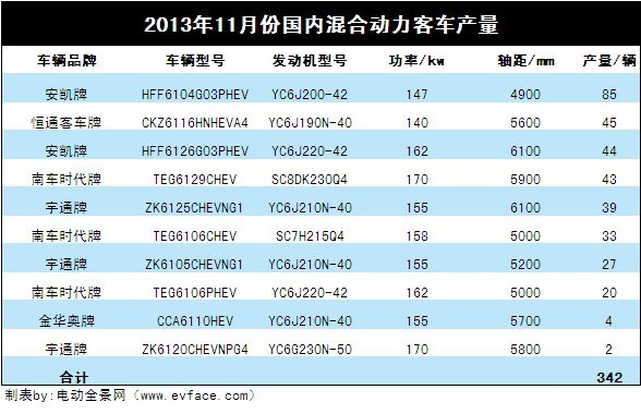11月我國國內混合動力客車產量342輛,其中油電混合動力客車225輛,氣電(非插電)混合動力客車70輛,插電式(氣電)混合動力客車47輛。由于對傳統混合動力客車的補貼暫未出臺,而且相較插電式