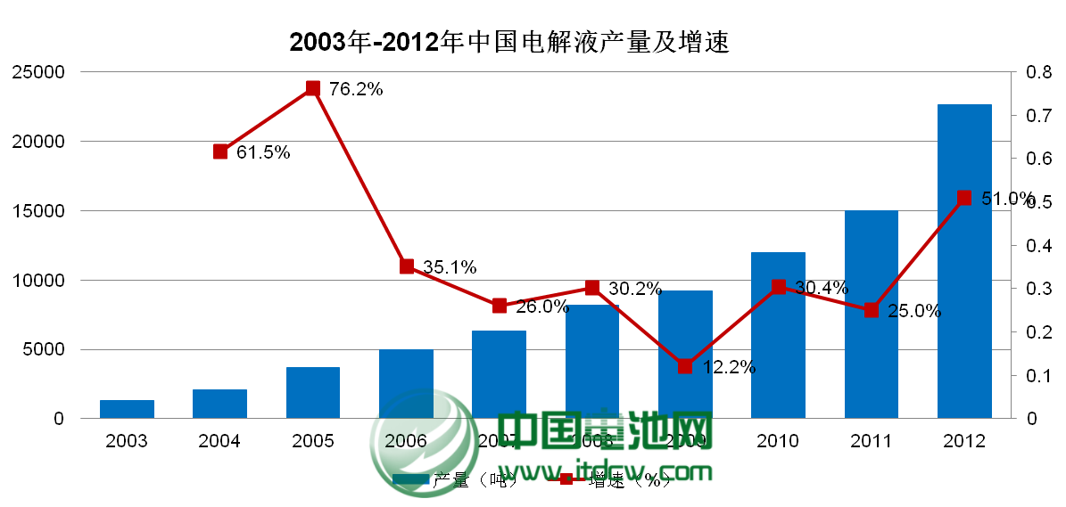 鋰離子電池市場的快速增長直接帶動了電解液材料產業的發展,從2003年起逐年增長,增幅大于20%;2012年電解液產量增幅最大,比去年增加51.0%。