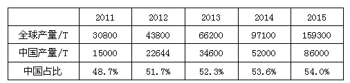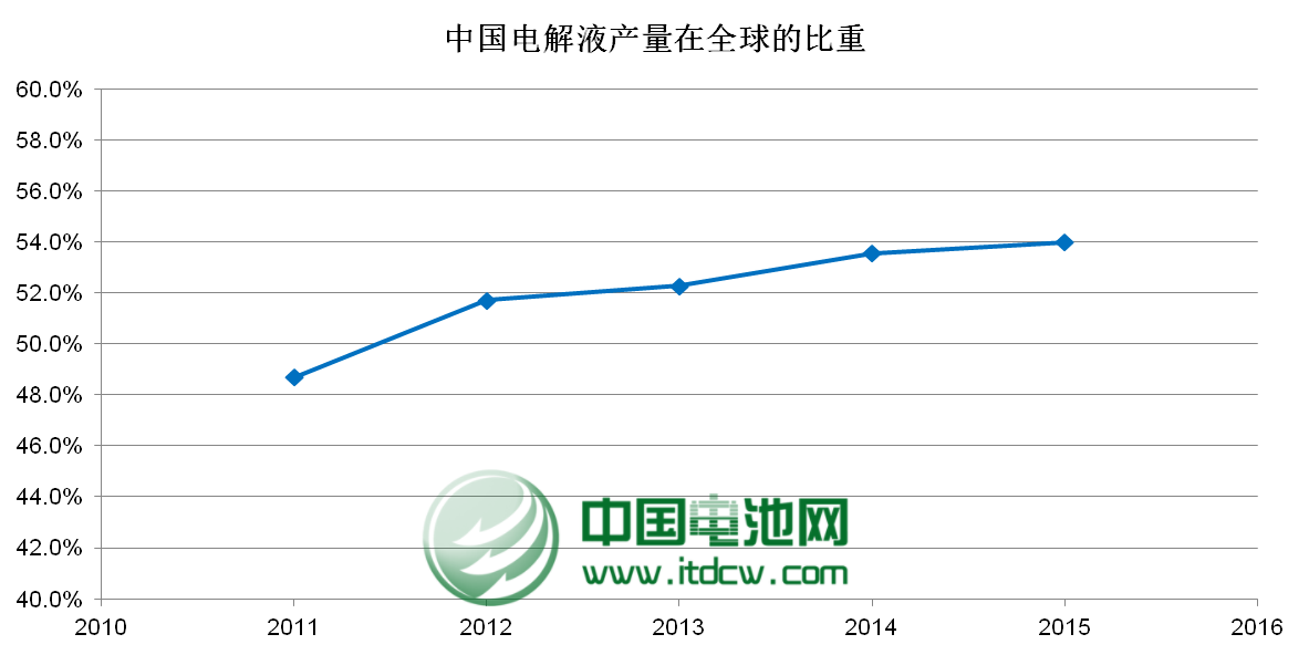 中國電解液產在全球的占比逐年增加,2012年首次過半,達到51.7%;2014年一部份電解液企業的擴產項目開始投入生產運營,預計當年產量占全球電解液產量的53.6%。