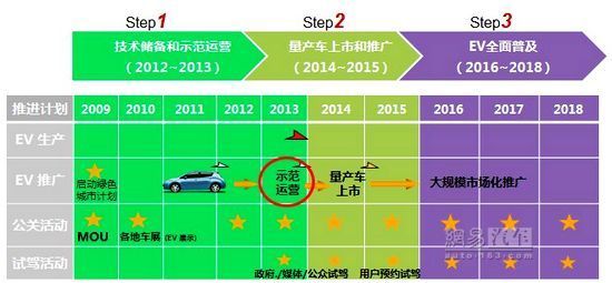 第一階段(2012-2013年):形成良好的技術儲備,與意向城市建立推廣合作關系開展示范運營;第二階段(2014-2015年):量產車上市并展開市場推廣;第三階段(2016-2018年):批量生產,規模推廣。