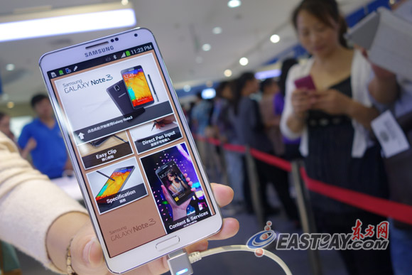 今天上午,東方網(wǎng)記者在浦東蘇寧超級店三星GALAXY Note 3發(fā)售現(xiàn)場看到,數(shù)百名三星鐵桿粉絲排起長隊(duì)等候,火爆程度和iPhone5S/5C上市時相比毫不遜色。最早前來排隊(duì)的班先生甚至自備小凳子,通宵排隊(duì)等候。不少消費(fèi)者表示,之所以投入三星的陣營,就是看中其產(chǎn)品屏幕大、硬件配置高,價格也和蘋果比具有競爭力。