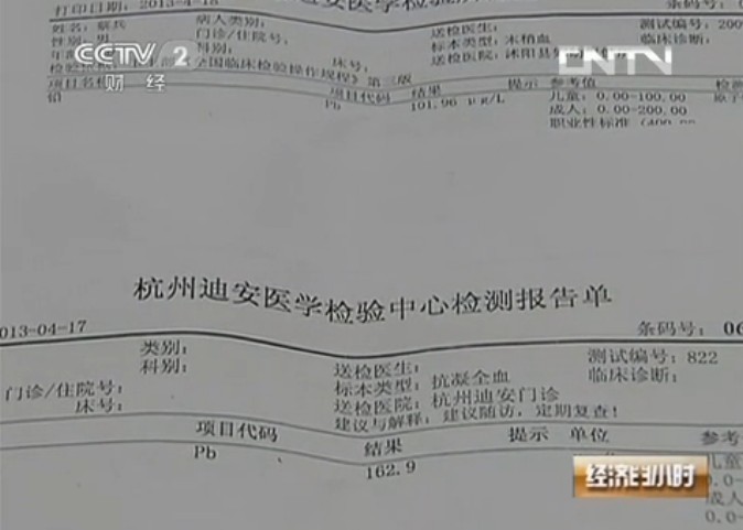 幾位家長都很擔心孩子的身體出現問題,分別去醫院對孩子的身體進行了檢測,查來查去找不到原因,最終,他們決定做一下血鉛檢測,檢測結果讓所有家長們大吃一驚。檢測結果顯示,這幾個孩子血液中的血鉛含量都超過了100微克每升,最高的竟然達到了162.9微克每升。