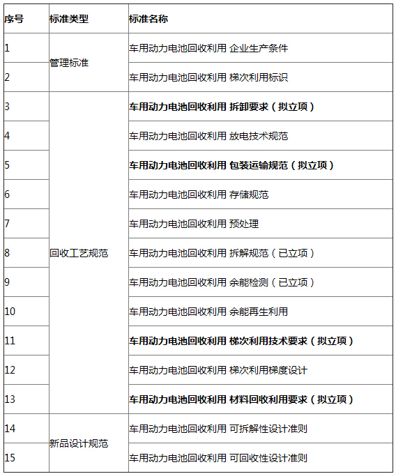 另外,針對車用動力電池回收,我國將發布一系列標準,從而建立相關標準的體系(見下表),全力保障動力電池的回收和利用,解決電動汽車使用的后顧之憂。
