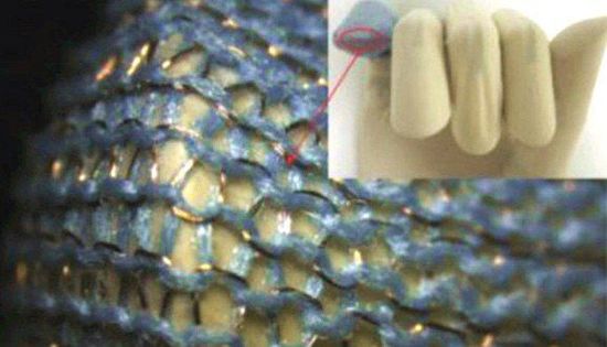 Xiao Ming Tao和她在香港紡織及制衣研究所的團隊做出了一種由預拉伸的彈性紗和聚氨酯涂膜銅纖維做成的織物,它是利用計算化的縫編機做成的。