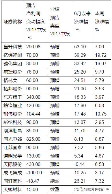 相比于近期股價上升的個股占據絕大多數來說,也有個別股票出現下跌。6月以來,55只概念股中,僅5只出現下跌,其中時代萬恒和天際股份已發布中報業績預告,時代萬恒下跌15.2%居跌幅榜首,該公司中報預計續虧,因林業子公司是否盈利存在不確定性以及隨著新建九夷鋰能公司廠房建設、設備投資的逐步展開期間費用增加,所以預計公司累計凈利潤可能為負。天際股份則小幅下跌0.14%,該公司預計實現凈利潤1.28億元至1.41億元,增長幅度為3.8倍至4.3倍。值得特別關注的是,該公司預增幅度僅次于國光電器,居于第2位。