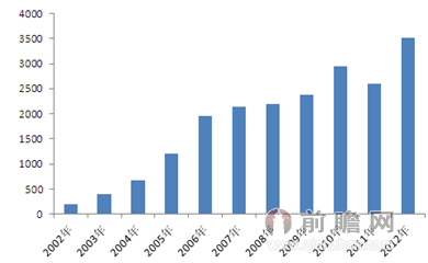 2002-2012年中國(guó)電動(dòng)自行車(chē)產(chǎn)量變化趨勢(shì)圖(單位:萬(wàn)輛)
