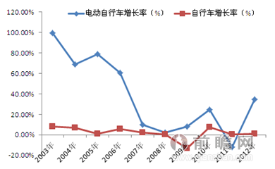 2003-2012年中國(guó)電動(dòng)自行車(chē)與自行車(chē)產(chǎn)量增速趨勢(shì)圖(單位:%)