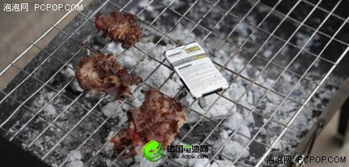 大約6分30秒左右的時候,烤肉已經焦糊,而KINGMAX電池的包裝外皮開始融化,電池也開始出現微微膨脹現象,證明其內部已經開始充滿化學氣體。這時全體人員的心也隨著電池的膨脹開始糾結起來,一方面隨時準備接受可能來臨的“砰聲一響”并隨時躲避可能出現的“彈片四射”;一方面又有些期待能看到爆炸的震撼場面。