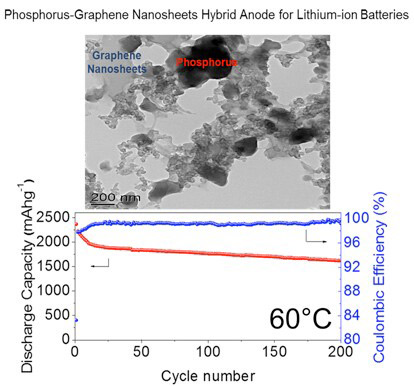 針對(duì)這一問題,最近美國賓夕法尼亞州立大學(xué)(The Pennsylvania State University)王東海教授領(lǐng)導(dǎo)的,以于昭新、宋江選為主的科研梯隊(duì)發(fā)明了一種新型鋰離子電池負(fù)極材料:“紅磷-石墨烯”納米復(fù)合材料。該種材料是由紅磷和石墨經(jīng)球磨制備得到。紅磷化學(xué)穩(wěn)定性高,廉價(jià)易得,而且環(huán)境友好。其作為鋰離子電池負(fù)極材料的理論容量可達(dá)2600 mAh/g,7倍于商用石墨電極。 石墨/石墨烯因其極高的電子電導(dǎo)率被引入到該體系中以提升納米復(fù)合材料整體的電子電導(dǎo)率。在高速球磨過程中,微米級(jí)的紅磷顆粒被打碎至納米級(jí)。石墨在球磨 過程中剝離為大比表面積的石墨烯。經(jīng)過長(zhǎng)時(shí)間機(jī)械力作用,石墨烯相互搭接形成一個(gè)緊密結(jié)合的三維導(dǎo)電網(wǎng)絡(luò),而納米級(jí)紅磷顆粒均勻分散在該網(wǎng)絡(luò)中。紅外光譜 (Infrared Spectroscopy)測(cè)試顯示,紅磷和石墨烯以“磷-氧-碳 (P-O-C)”的化學(xué)鍵形式結(jié)合在一起,這又為該材料出眾的電池性能提供了保證。在室溫下,該納米復(fù)合材料的放電容量可達(dá)1400mAh/g,4倍于現(xiàn)行商用化鋰離子電池負(fù)極材料–石墨。 經(jīng)過300周的循環(huán),放電容量仍然能保持在60%以上。高溫環(huán)境(60°C)對(duì)于現(xiàn)行商用鋰離子電池仍是很大的挑戰(zhàn)。而該種材料,在60°C下,放電容量可進(jìn)一步提升至1650mAh/g。經(jīng)過200周循環(huán),放電容量保持率可在70%以上。
