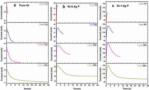 電沉積(a)和協同沉積(b, c)在及時電流曲線中差別:電流的下降區(a)在協同沉積過程中消失