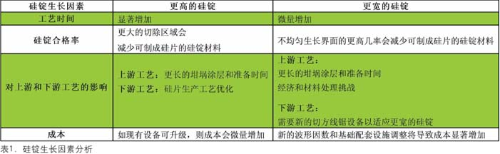 還有其它一些與生產(chǎn)更大硅錠相關(guān)的上游和下游生產(chǎn)問題,這些問題會(huì)影響生產(chǎn)成本,因此必須在固定資產(chǎn)設(shè)備的采購決策中加以考量。從上游來說,坩堝成本將隨著坩堝尺寸的增加而增加,而坩堝的準(zhǔn)備成本也會(huì)隨著涂層工藝的日益復(fù)雜而增加。從下游來說,更寬的硅錠可能需要更大的切方線鋸設(shè)備來進(jìn)行處理。最后,如果硅錠生長和線切割操作之間的生產(chǎn)線平衡無法維持,總體硅片生產(chǎn)力也會(huì)下降。生產(chǎn)更多可制成硅片的硅錠材料可能會(huì)增加生產(chǎn)能力和爐子的利用率,但如果線切割操作無法處理增加后的材料或波形因數(shù),就可能會(huì)出現(xiàn)在制品(WIP)瓶頸或降低線鋸利用率,從而導(dǎo)致硅片生產(chǎn)運(yùn)營的總體生產(chǎn)力下降。影響硅錠生長的因素分析見表1。