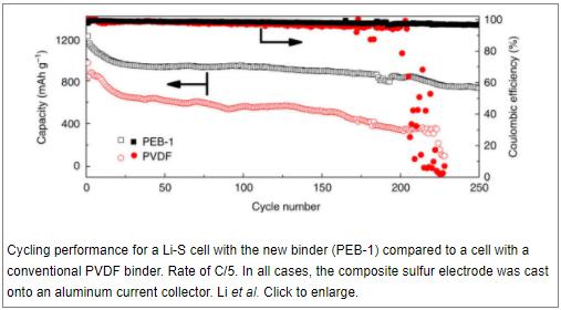 相較于傳統(tǒng)型鋰硫電池,新款聚合物粘合劑的電容量翻了一番,即使在高電流密度(high current den ... 查閱全文
