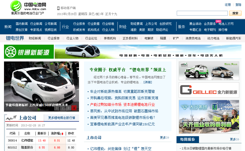“鋰電世界”下設“財經新聞”、“上市公司”、“行業報告”、“行業人物”、“行業論壇”、“券商機構”、“正負極材料”、“電解液”、“隔膜”、“礦產”、“消費類電池”、“動力電池”和“新能源汽車”等十幾個子欄目,從新聞、行業等資訊和圍繞鋰電材料、產品及上下游產業鏈的不同角度去涵蓋和解讀“鋰電”這一當下最熱的投資領域和產品市場。中國電池網不僅僅提供專業、權威的行業資訊,還從財經投資的角度去關注電池行業的投資走向,去分析行業的市場走勢,去觀察從原料到材料到技術的先進制造動向。中國電池網不僅提供一些行業風云人物的創業歷程,還從券商、投資機構的角度,去深挖上市公司的趨勢動向和市場價值。