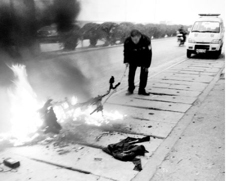 王先生趕緊跳下來,“不到半個小時就燒成一副架子了。”王先生的同事、車主宋先生說,“這輛車是在中州大道上一家專賣店里買的。牌子是‘濟(jì)南輕騎’,花了3000多元,才用了兩個月。”