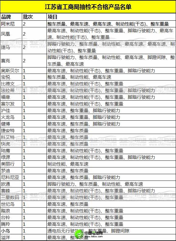 2012年3月,江蘇省工商局通報了2011年電動車商品質量監測結果,有34批次商品被查不合格。其中包括了鳳凰、踏浪、科艾特、阿米尼、火龍鳥、捷馬、尼科尼亞、世紀鳥、捷安特等多個品牌電動車。抽檢不合格的項目多集中在最高車速、整車質量、整車重量、制動性能(干態)和腳踏行駛能力等。