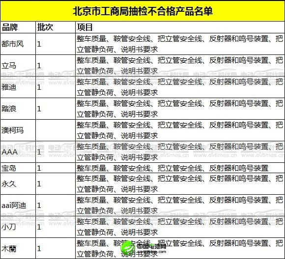 北京市工商局:11批次產品不達標 北京市工商局去年11月通報了流通領域電動自行車商品質量監測結果,踏浪牌TDT01Z、永久牌TDR05Z等2個型號的電動自行車樣