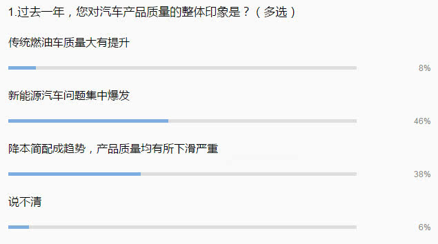 除了新能源汽車(chē)問(wèn)題的集中爆發(fā)外,新車(chē)產(chǎn)品質(zhì)量嚴(yán)重下滑成為參與者們的第二大選擇項(xiàng),該項(xiàng)參與人數(shù)占比達(dá)38%。正如J.D. Power(君迪)發(fā)布的2018中國(guó)新車(chē)質(zhì)量研究報(bào)告所述,在持續(xù)多年的提升之后,中國(guó)汽車(chē)行業(yè)整體新車(chē)質(zhì)量在2018年有所退步,不過(guò)該研究指出,退步的原因主要是導(dǎo)航不夠準(zhǔn)確、語(yǔ)音識(shí)別差等設(shè)計(jì)類(lèi)問(wèn)題的增加。