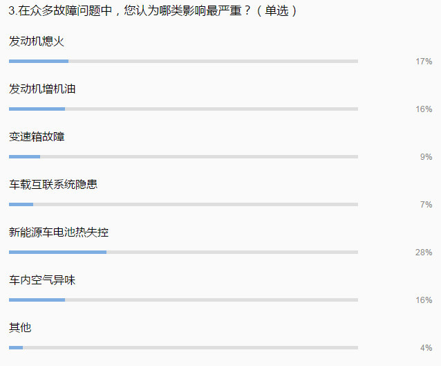 因此,在調(diào)研問(wèn)題3中,當(dāng)被問(wèn)及“眾多故障問(wèn)題中,哪類(lèi)影響最嚴(yán)重”時(shí),28%的參與者毫不猶豫地選擇了“新能源汽車(chē)電池?zé)崾Э亍薄?jù)了解,當(dāng)電池工作時(shí)產(chǎn)生的熱量不能及時(shí)排出,高溫就會(huì)影響動(dòng)力電池壽命甚至出現(xiàn)熱失控,重則導(dǎo)致起火。