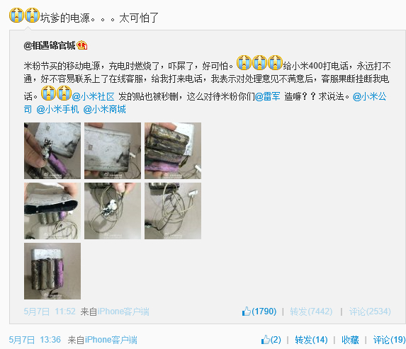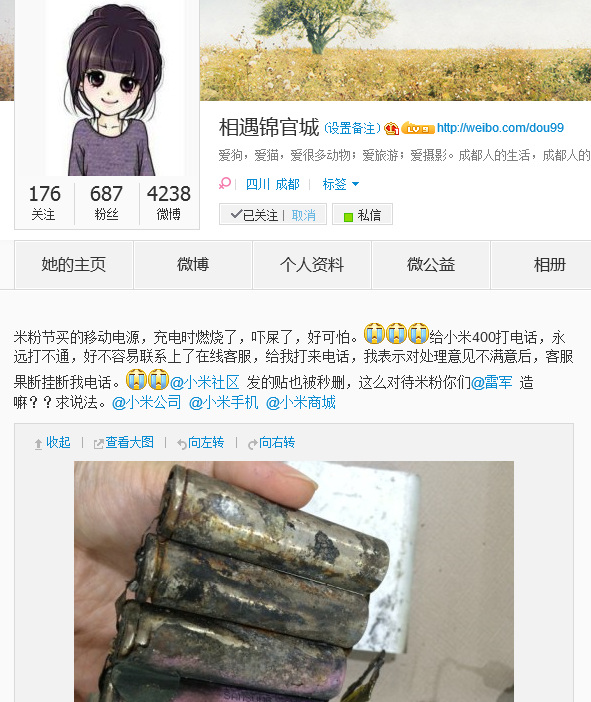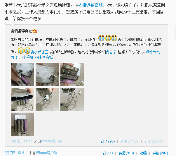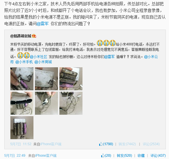 5月7日中午12點左右,一位成都的女性微博網友@相遇錦官城發微博稱:米粉節買的移動電源,充電時燃燒了,嚇屎了,好可怕。給小米400打電話,永遠打不通,好不容易聯系上了在線客服,給我打來電話,我表示對處理意見不滿意后,客服果斷掛斷我電話。@小米社區 發的貼也被秒刪,這么對待米粉你們@雷軍 造嘛??求說法。